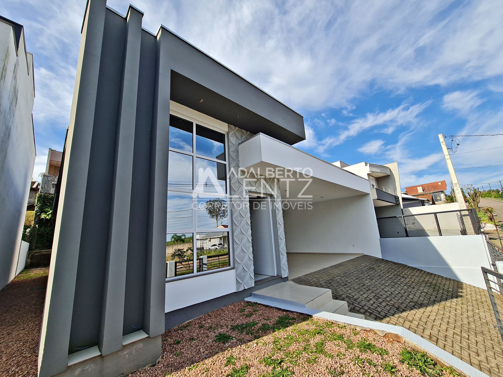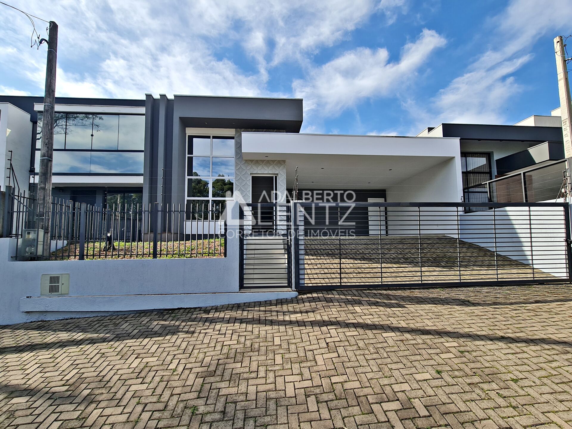 Adalberto Lentz Imóveis Vende Casa com 3 dormitórios sendo 1 suíte + 2 suítes americanas, plana, cozinha americana integrada com sala de jantar/estar, pé direito alto, churrasqueira, espaço para 2 home offices, 1 lavabo, lavanderia fechada, espera para água quente, espera para energia solar, área privativa de 134,74 m² em alvenaria, terreno medindo 12 × 27,09 metros com amplo pátio nos fundos, 2 vagas de garagem cobertas e espaço para mais 2 carros no pátio.